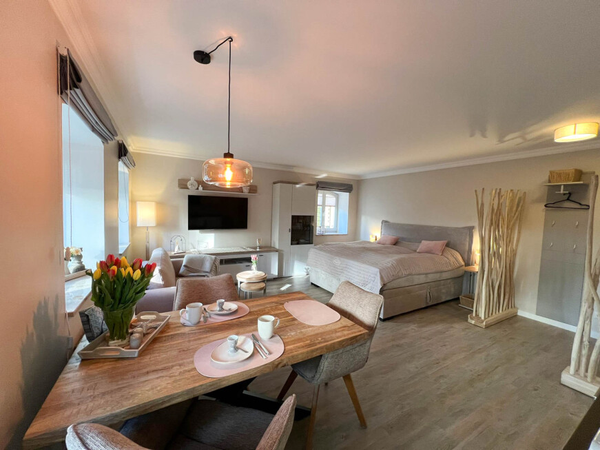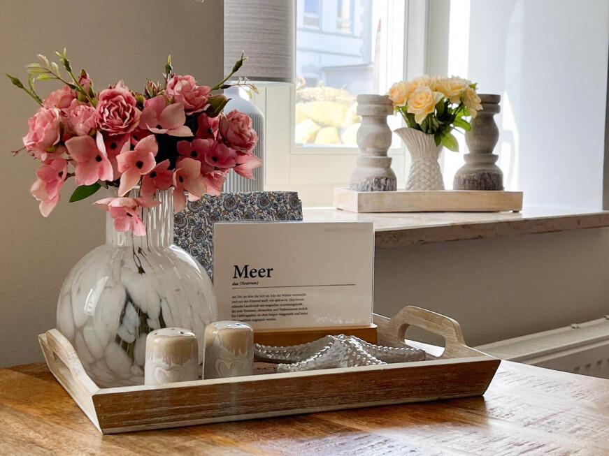 Genießen Sie Ihre persönliche Auszeit in unserer geschmackvollen und frisch möbilierten Ferienwohnung in lichtdurchfluteter Halb-Souterrain Lage im Erdgeschoss des Nachbarrhauses in der Boysenstr. 17. Nach einem erholsamen Schlaf im großen Designerbett erwartet Sie unser Frühstücksbuffet von 7 bis 11 Uhr im Haupthaus (Boysenstr. 14). Dort können Sie sich gerne auch gratis eine unserer Kaffespezialitäten gönnen, jederzeit während unserer Öffnungszeiten. Danach können Sie ganz spontan entscheiden, wie Sie den Tag weiter erleben möchten - im hauseigenen Strandkorb oder wo auch immer... und ganz sicher mit der frischen Nordseeluft in der Nase!